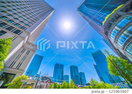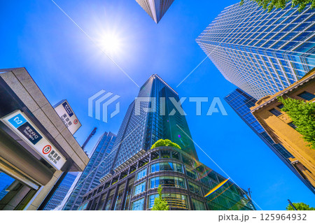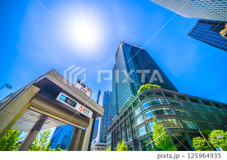 日本の東京都市景観 東京メトロ丸ノ内線東京駅(出入口M10)やハロ、丸の内のビル群を望む