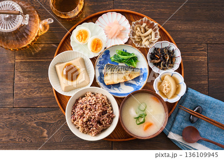 小鉢を並べた和朝食 雑穀米と味噌汁、鯖の塩焼き
