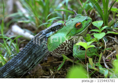 捕食 蛇に呑まれるモリアオガエル