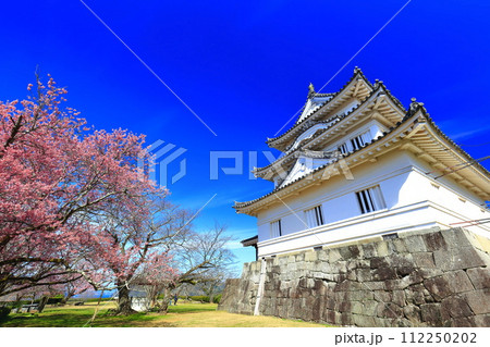 【愛媛県】晴天の宇和島城と満開の薄紅寒桜