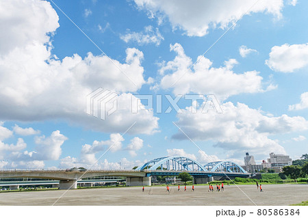 夏空広がる多摩川河川敷のグラウンドと丸子橋 神奈川県川崎市