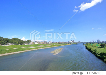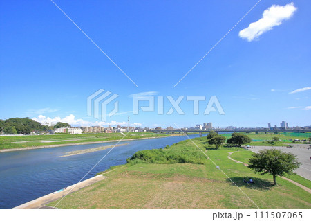 緑と夏空のコントラストが鮮やかな多摩川河川敷と丸子橋 神奈川県川崎市