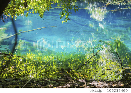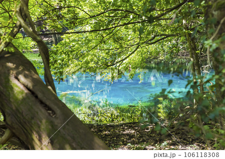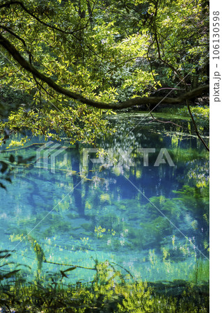 初夏の山形県遊佐町 神秘の泉 新緑の丸池様