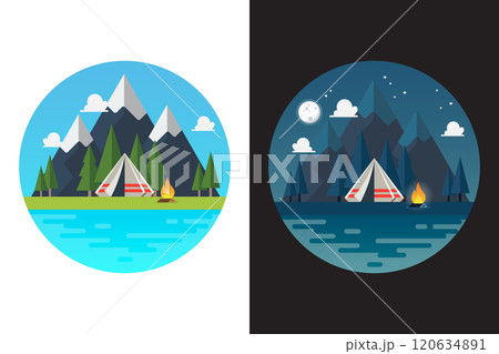 Camping tent with landscape at day and night logos