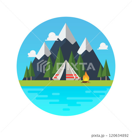 Camping tent in forest at the river color vector illustration in circle.