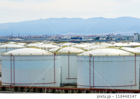 Many large round white reservoirs of chemical products in the port industrial terminal