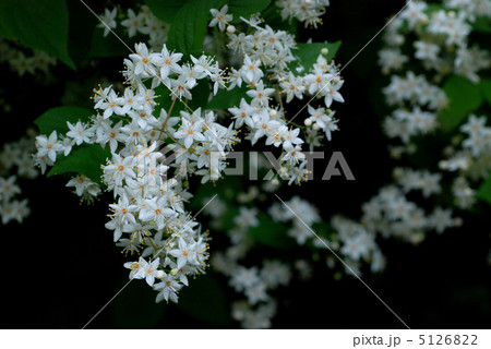 雑木林の中で一際明るく輝く白いマルバウツギの花房(自然光+マクロ接写写真)