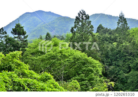 シロヤシオツツジ咲く丹沢山稜線から見る新緑の渓谷