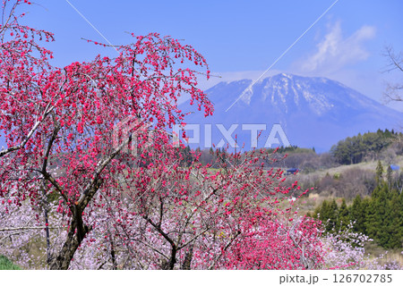 丹霞郷の桃の花と妙高山 黒姫山 飯綱山