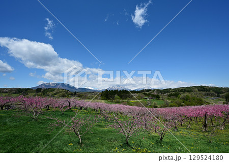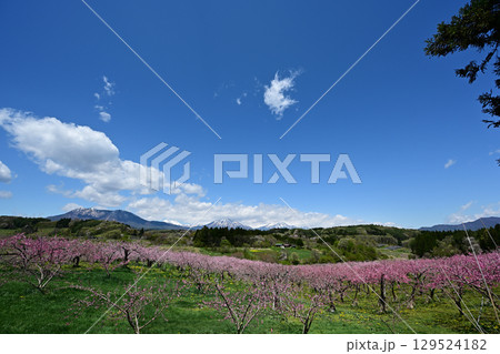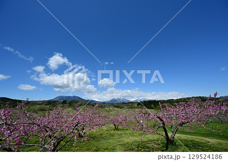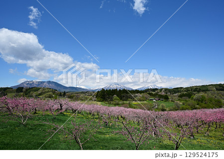 丹霞郷の桃の花と妙高山 黒姫山 飯綱山