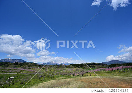 春の花が咲く丹霞郷と北信の山々と青空と
