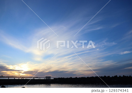 夏の青空に浮かぶすじ雲と港の朝焼け