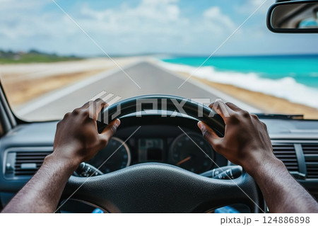 Driving towards beautiful tropical beach POV, hands firmly hold steering wheel, turquoise ocean water meets white sand ahead, perfect idyllic beach destination visual for travel promotion beach fun.