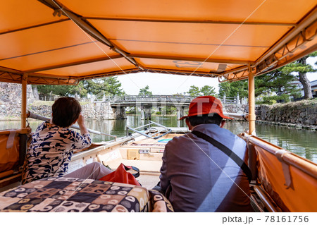 島根県松江市 松江城の堀川めぐりの遊覧船 橋と石垣
