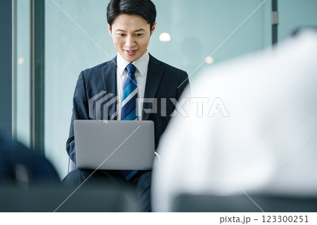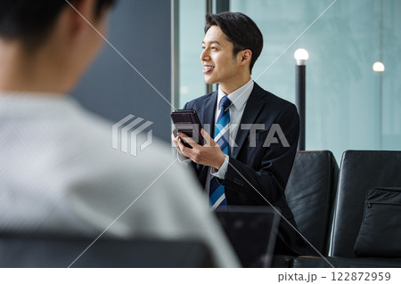 ロビーでノートパソコンを使って仕事をするビジネスマン