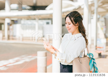 駅・ステーションのロータリーでスマホを使う女性(アプリ・モバイルチケット・チケットレス・電子乗車券)