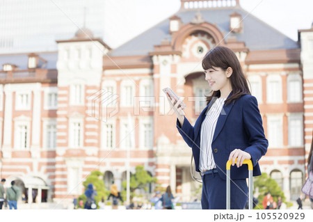 東京駅の前でスマホを見るビジネスウーマン 出張イメージ