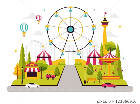 Theme Parks Vector Illustration featuring an Amusement Park with a Ferris wheel, Fun Game Booths, a Ticket Box, and Trade Fair Stalls in a Background