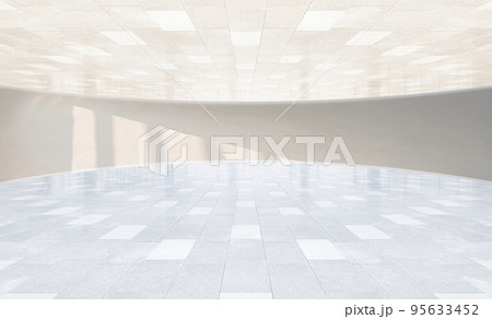 現代抽象弧形藝術建築與無人磚地廣場,有著幹淨明亮的天空背景,3D渲染。