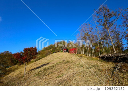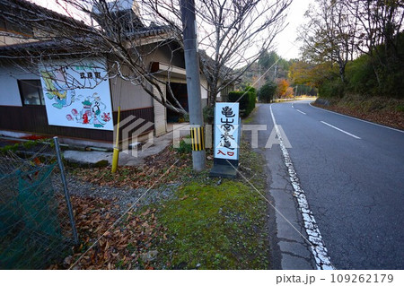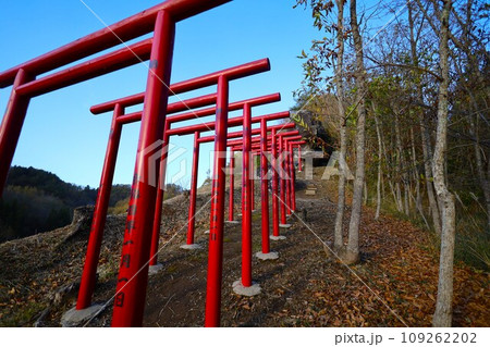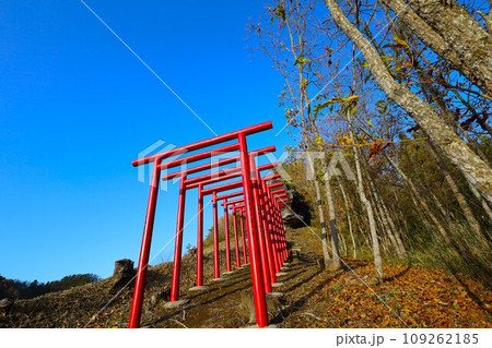 大分県玖珠町、耶馬渓方面へ向かう県道二十八号線をドライブ、赤い鳥居が並ぶ山を見つけ