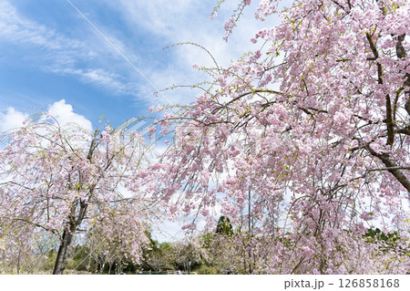 うららかな春日和の光芒に映える美しい桜の花「長湯温泉しだれ桜の里」大分県竹田市