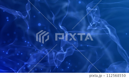 Blue blurry smoke particles floating in the air and changing the shape with shiny round dust particles. Shiny particle waves smoothly moving with soft bokeh effect.