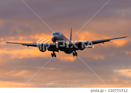夕焼けに浮かぶ飛行機 背景にさまざまな表情の雲 空 太陽 夕空 朝焼け