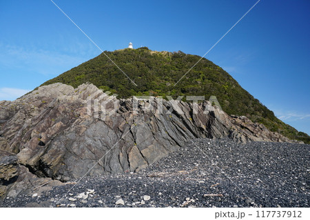 青空を背景にした室戸岬の灌頂ヶ浜から観た室戸岬灯台と大地の風景 Ver2