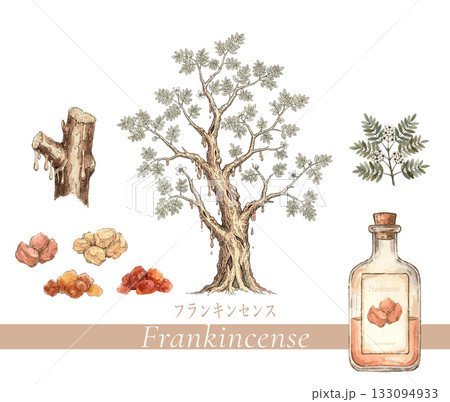 フランキンセンスとフランキンセンスの精油瓶・乳香・アロマ・精油のイラスト