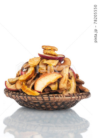 Heap of dry slice apples in a wooden plate. Isolated