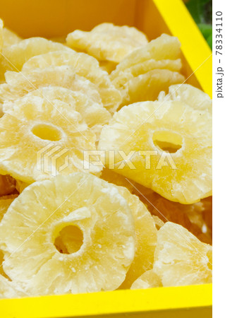 Candied fruit pieces of pineapple for sale in a market