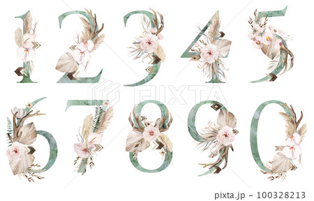 Watercolor green numbers with antlers, dried leaves and tropical flowers bouquet, Boho illustration