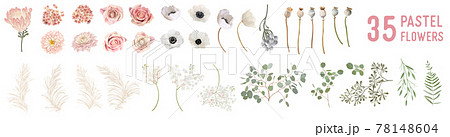 Vector flowers and leaves, dried anemone, wedding roses, pampas grass, eucalyptus greenery