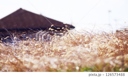 Dried sunflower outdoors under the snow. Beautiful winter banner