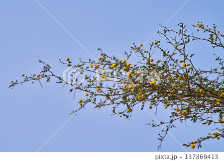 青空を背景にしたアカシアの黄色い花をつけた枝