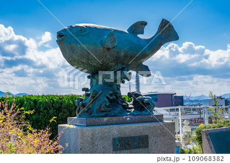下関市の亀山八幡宮境内にあるふくの像と関門海峡