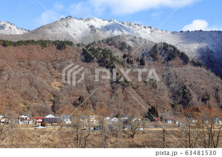冬晴れの爼倉山と山麓の集落-亀岡橋から 福島県只見町