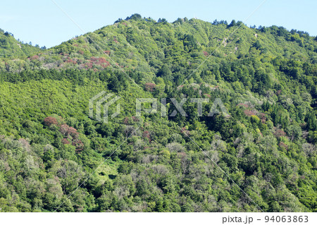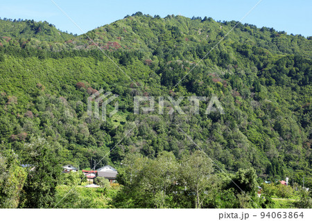 秋の爼倉山の緑と黄緑の樹林とナラ枯れの被害ー亀岡橋から 福島県只見町