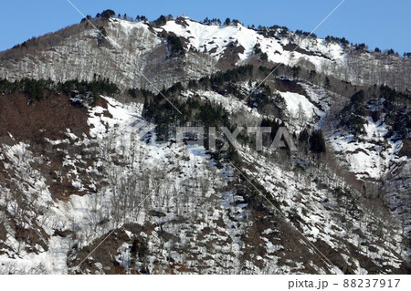 豪雪地の里山、落葉樹林と雪崩斜面-亀岡橋から 福島県只見町