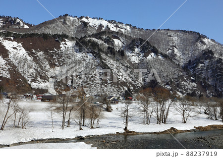 里山と集落と雪解けの伊南川の流れ 福島県只見町