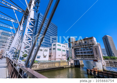 日本の東京都市景観 南高橋から亀島川水門や大川端リバーシティ21などを望む