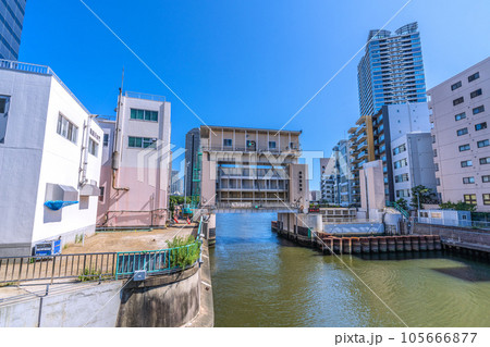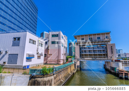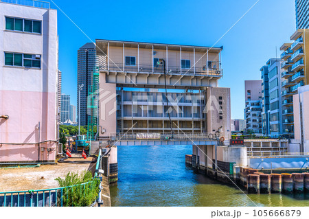 日本の東京都市景観 南高橋から亀島川水門などを望む(水門の左奥は大川端リバーシティ21方向)