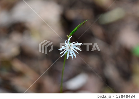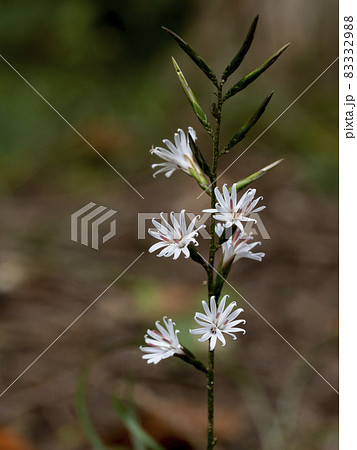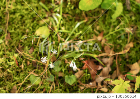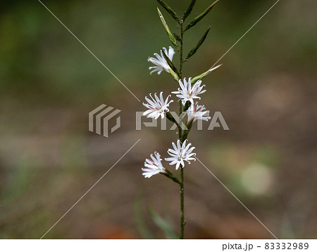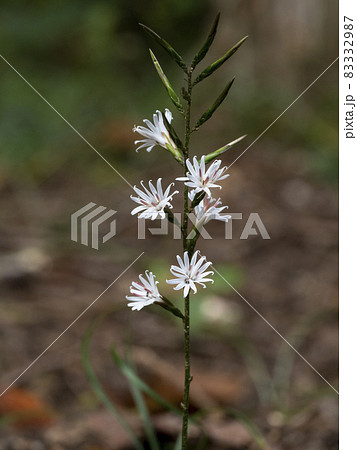 自然 植物 キッコウハグマ、秋に咲く花。十一月の林、足元に小さな白い花