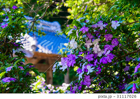 (静岡県)伊豆下田、満開のアメリカジャスミン(ニオイバンマツリ)が美しい、了仙寺