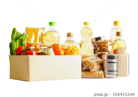 Foodstuffs in donation box isolated on white background for volunteer to help people.