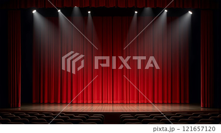 無人のステージ、これからリハーサルが始まります。赤いカーテン。スポットライト