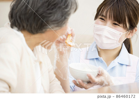 感染対策をしておかゆを食べさせる介護士女性