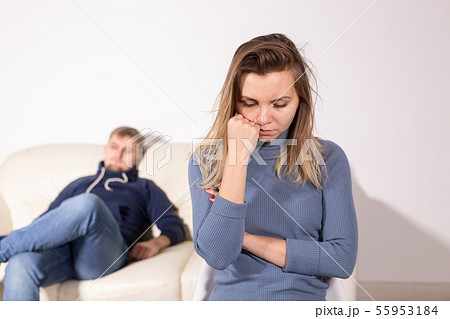 domestic violence, abuse and family concept - crying woman and her husband on the background