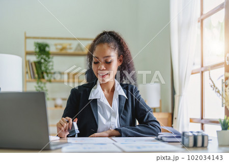 Picture of African Americans businesswoman stamping budget approval on financial documents