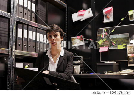 Police officer explaining criminal case to remote coworker during online videocall meeting conference, discussing crime scene report. Private detective working at federal investigations in dark room